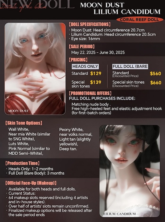 Two new 68cm female BJDs, Lilium Candidum and Moon Dust have been released by Coral Reef Doll. They will be available until the end of next month, after which both dolls will be discontinued.