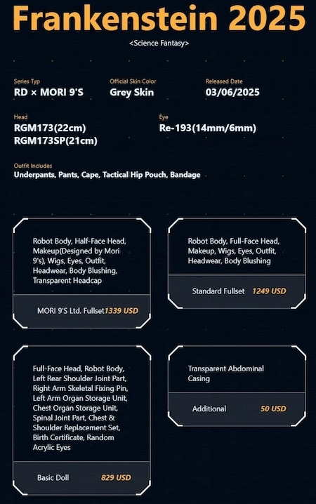 Limited Frankenstein may be ordered in normal, normal yellow, white, grey, tan, or light tan resin. He comes with an RGMbody-07SP-75 Robot body. The basic doll is sold blank and is not available in grey resin.