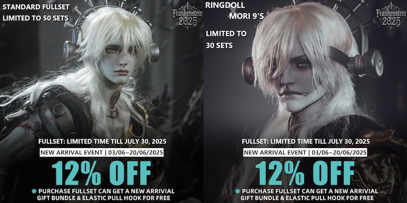 An elaborate reimagining of Grown-line Frankenstein is now at Ringdoll. He comes in two limited edition versions: Ringdoll X Mori 9 is limited to 30 sets, and the Standard version is limited to 50 sets. The 75cm tall BJD is on sale until June 20th. Both special versions will be discontinued on July 30th. A basic version of the doll may also be ordered.