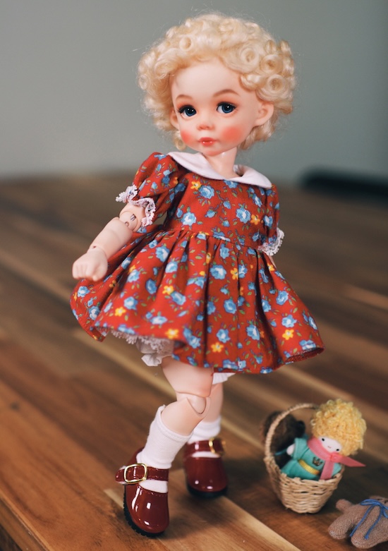 A 1/6 BJD girl from Korean company Mazarine Blue Doll is available. Peggy the Retro Girl will come with a face-up, blonde curly wig, glass eyes, dress, undergarments, shoes, socks, and extra hands.