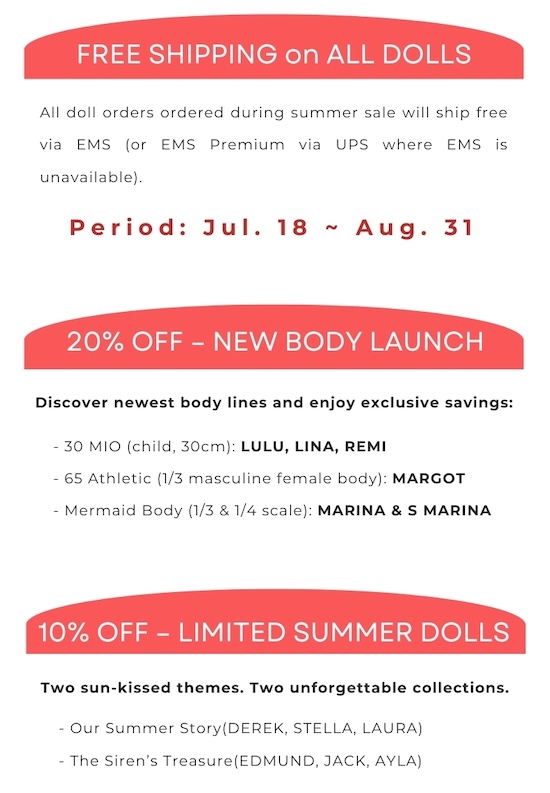 A Summer Event discount on the dolls runs until July 31st. The child dolls are discounted by 20% while the adult dolls are being sold at a 10% discount.