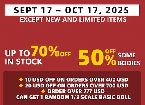 A sale for National Day is currently being held at Ringdoll. Three dolls have been re-released. Discounts are offered for in-stock dolls and some bodies.