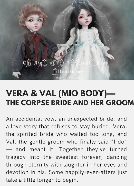 New Halloween 30 Mio line special dolls The Corpse Bride and her Groom, have arrived at SartoriaJ. Limited edition Vera and Val, will be available until November 2nd. The dolls come with a girl or boy body in resin colors, pale moon, rosewater, peach cream, Sonoran beige, or amber beige. They may be ordered blank or with a face-up.