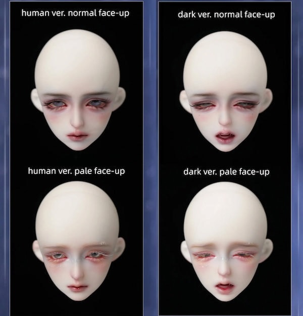 A face-up in normal or dark version and a black or gold wig may be added. Body blushing in blue, black, or “burnt” is also available. Limited slots are available for blushing. The additional head may be added. Optional accessories include a Thorn Crown and wing ears in translucent or white resin. Blushing for the parts may be added.