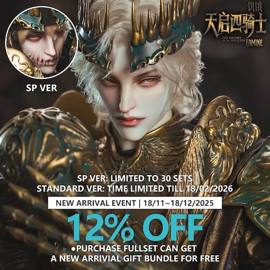 Customers may purchase a blank basic doll with a standard head, a standard version full-set, an SP version full-set, or a double-head full-set. The SP and double-headed full-sets are limited to 30 dolls. All full-sets will include face-up service, eyes, an outfit, a wig, shoes, and his painted crown, chest armor, shoulder armor, and wrist armor.