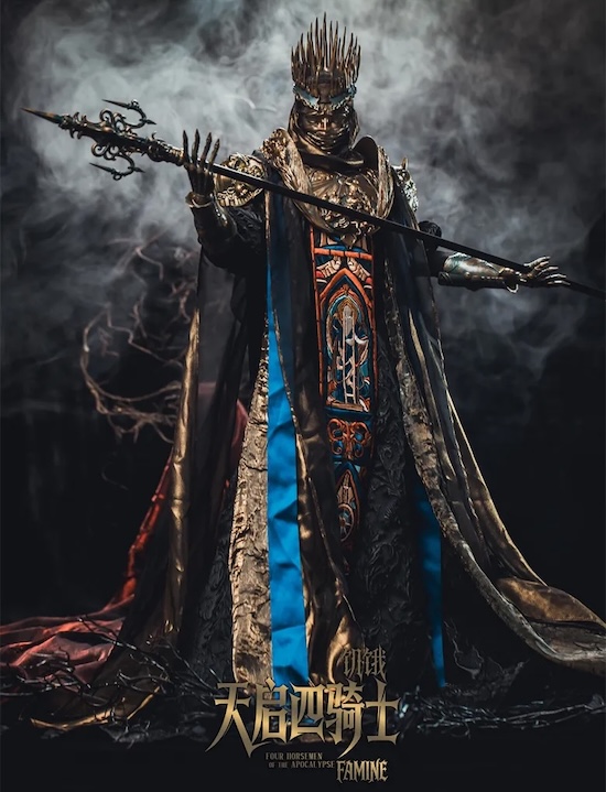 Options for Famine include a mask, a weapon with a holding hand, a pair of armored hands, and an additional mohair wig. The crown and body armor are also sold separately.