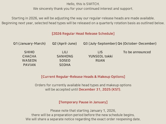 SWITCH News November 29, 2025 by bjdcollectasy Beginning in 2026, SWITCH will change the release schedule for non-limited male and female doll heads. From the company: