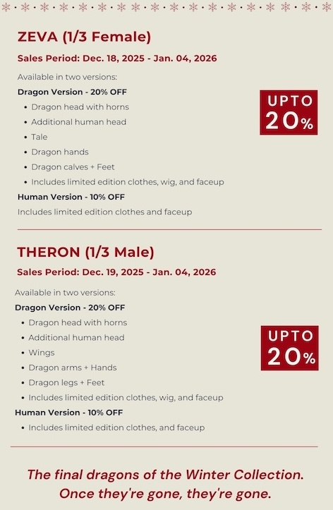 Both Zeva and Theron are part of the SartoriaJ Winter Event. The dragon version dolls are discounted by 20%, and the human versions are 10% off. An optional 6-month layaway is offered.