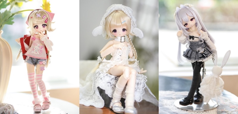 Three 31cm tall anime-style dolls, PPEI04, PPEI05, and PPEI06, have been released. They come with a PPEI body and a 1/4 size head. Each girl can be ordered with a choice of small or big hands, a 1 or 2-part torso, and bent or straight legs.