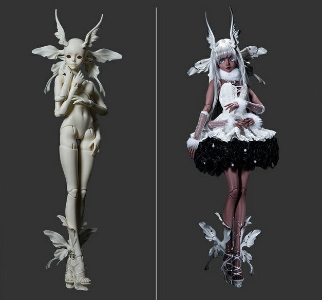 Ghost Moth is sold blank with random color eyes, and additional parts including a moth headdress set, moth high heeled shoes set (including white ribbon), shoulder replacement single arm inserts. Options include a face-up, body blushing, and parts painting.